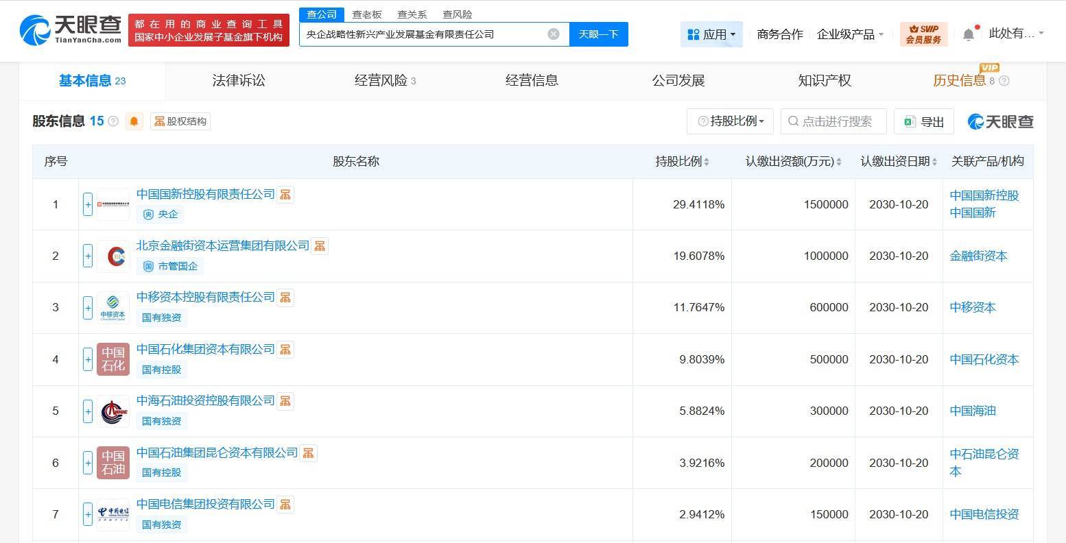 在此之前,今年10月,央企战新产业发展私募基金管理有限公司也已成立策利配资,注册资本1亿元。经营范围包含:私募股权投资基金管理、创业投资基金管理服务。出资股东包括中国国新、中国移动以及中国石油、中国石化和中国海油五家央企各自的资本投资平台。